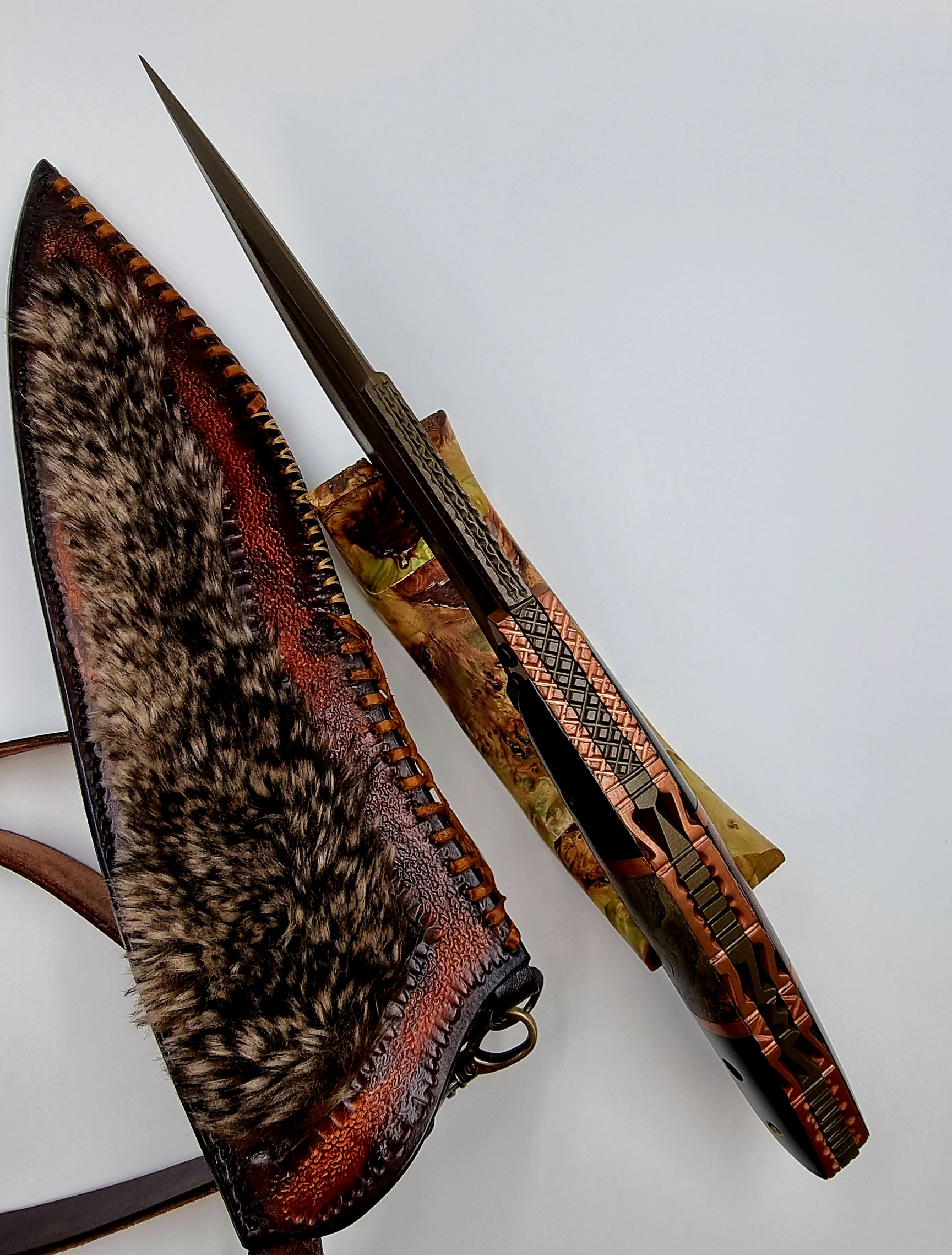 Engraved, compact material & maple burl wood & copper combination